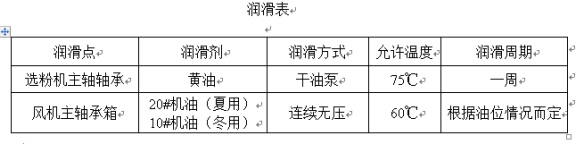 在日常運(yùn)行中,應(yīng)保證各潤(rùn)滑點(diǎn)充分潤(rùn)滑,并定期對(duì)粉分離器內(nèi)軸承和風(fēng)機(jī)軸承進(jìn)行潤(rùn)滑(見(jiàn)下表)。在日常維護(hù)中,注意粉體分離器轉(zhuǎn)子的平衡。如發(fā)現(xiàn)異常振動(dòng),應(yīng)立即停機(jī)檢查原因,并可在運(yùn)行前繼續(xù)故障。